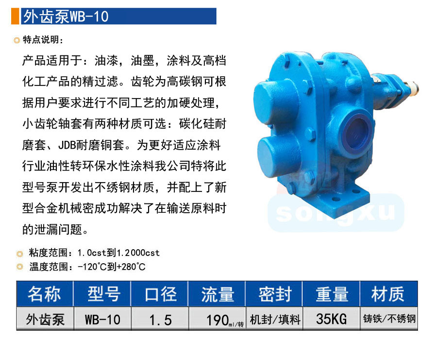 产品适用于:油漆,油墨,涂料及高档 化工产品的精过滤。齿轮为高碳钢可根 据用户要求进行不同工艺的加硬处理, 小齿轮轴套有两种材质可?。禾蓟枘? 磨套、JDB耐磨铜套。为更好适应涂料 行业油性转环保水性涂料我公司特将此 型号泵开发出不绣钢材质,并配上了新 型合金机械密成功解决了在输送原料时 的泄漏问题。