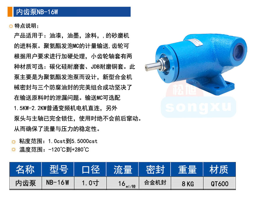 产品适用于:油漆,油墨,涂料,,的砂磨机的进料泵。聚氨酯发泡MC的计量输送,齿轮可根据用户要求进行加硬处理,小齿轮轴套有两种材质可选:碳化硅耐磨套、JDB耐磨铜套。此泵主要是为聚氨酯发泡泵而设计,新型合金机械密封与三个防腐油封的完美组合成功坚决了在输送原料时的泄漏问题。输送MC可选配1.5KW-2.2KW普通变频机电机直连,另外泵头与主轴已完全锁住,使用时绝不会前后窜动。从而确保了流量与压力的稳定性